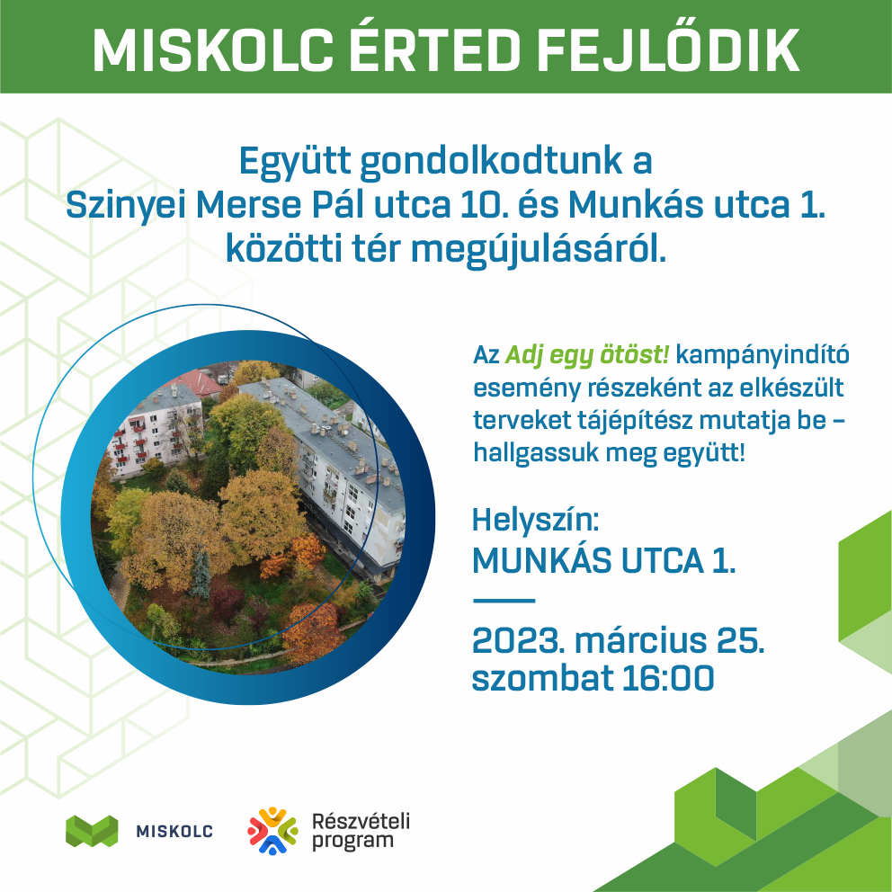 Ezeknek a figyelembevételével készültek el azok a tervek, amelyek már véglegesnek tekinthetőek. Március 25-én szombaton, a Kilián Észak Közössége „Adj egy ötöst!” nevű adománygyűjtő rendezvényének részeként visszatérnek a szakemberek a városrészbe, hogy 16 órától minden érdeklődő számára megmutassák: hogyan újul majd meg a városrész egyik közterülete.
