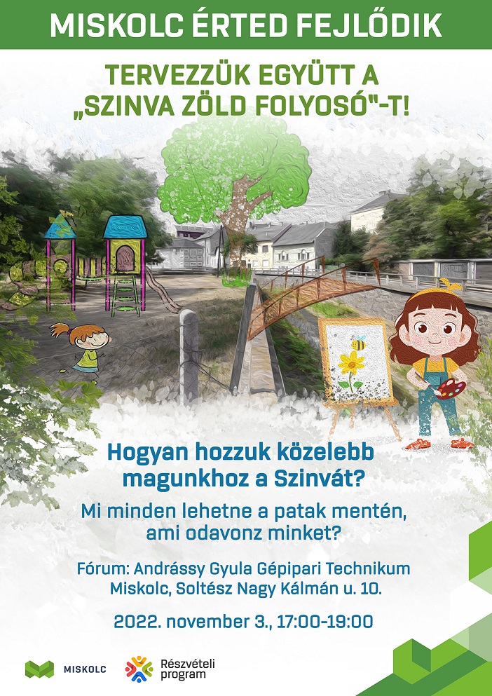 - 2022. november 3-án, csütörtökön délután 5 órai kezdettel közösségi tervezésre invitálja a miskolci Részvételi program az érdeklődő városlakókat az Andrássy Gyula Gépipari Technikumba (Soltész N.K. u. 10.). A közösségi tervezés tárgya: a „Szinva Zöld Folyosó”.