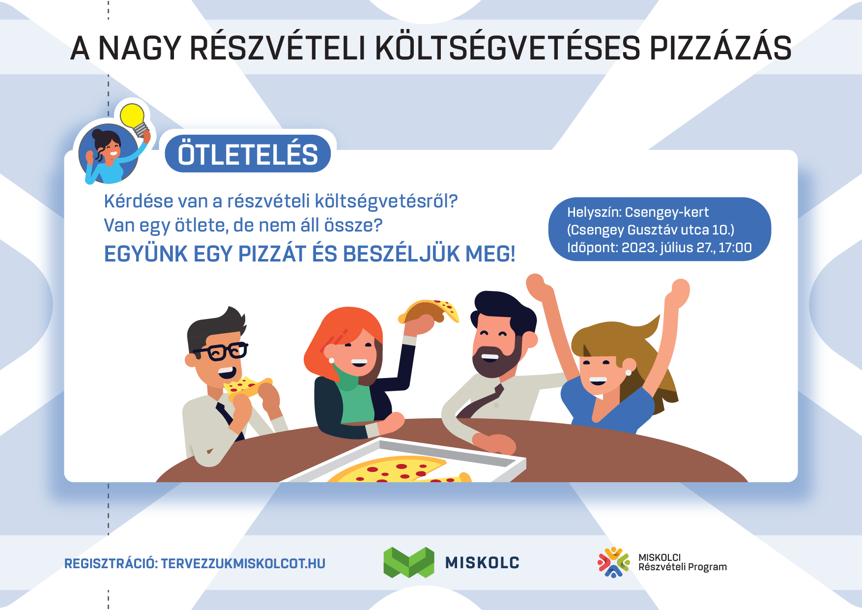 2023. július 27-én, 17 órától a Csengey-kertben (Csengey Gusztáv utca 10.) megrendezzük „A nagy részvételi költségvetéses pizzázást”, amit egy olyan közösségi eseménynek szánunk, amin bárki részt vehet, aki érdeklődik a részvételi költségvetés iránt, vagy esetleg kérdése akad – közben pedig szívesen elfogyasztana pár szelet pizzát, amire megvendégeljük a résztvevőket.