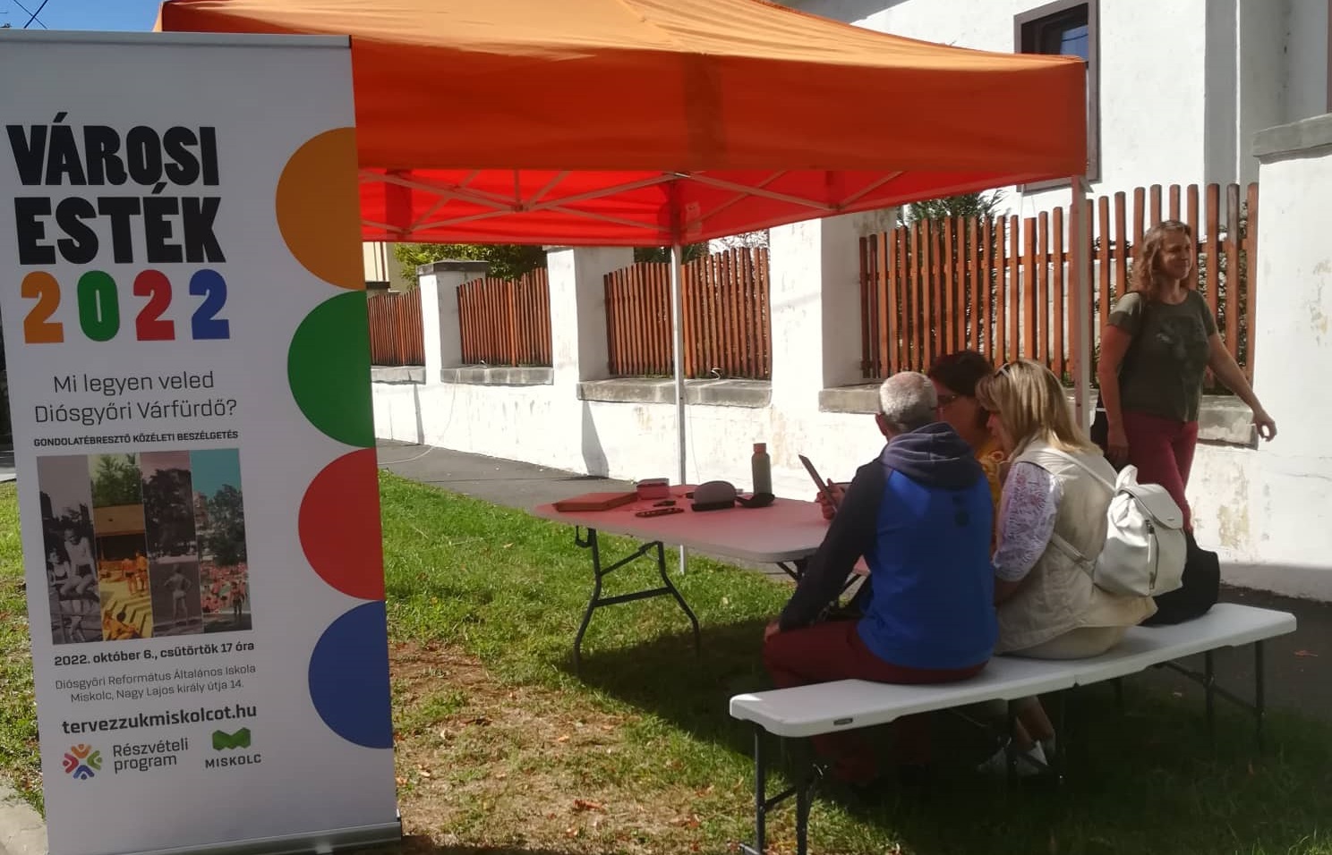 A Városi Esték szervező stábjának három tagja vasárnap a helyszínen, a diósgyőri búcsú kapcsán várta az érdeklődőket, beszélgetést kezdeményezve a volt strand területének sorsáról.